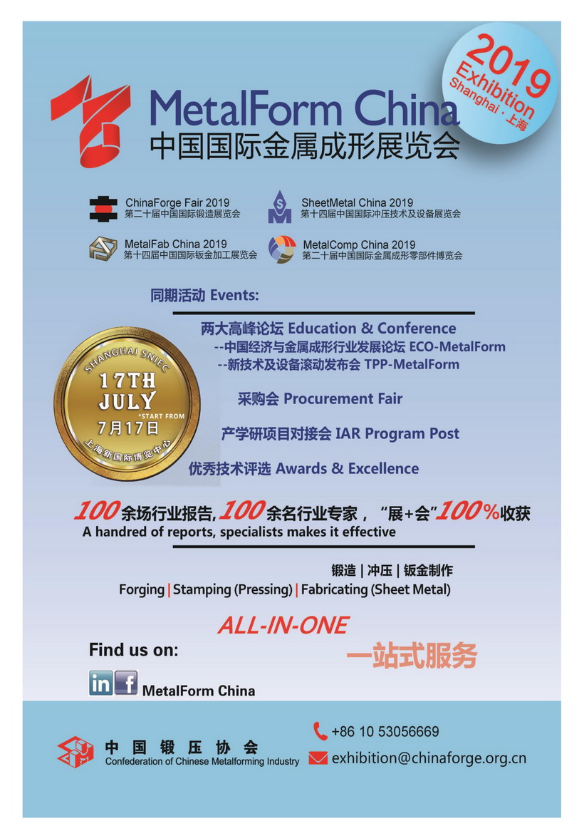 中國(guó)鍛壓協(xié)會(huì)的品牌展覽會(huì)―中國(guó)國(guó)際金屬成形展單年回到上海舉辦,主題是:“新時(shí)代、新技術(shù)、新未來”,誠(chéng)邀貴公司參展!該展包含四個(gè)主題展: