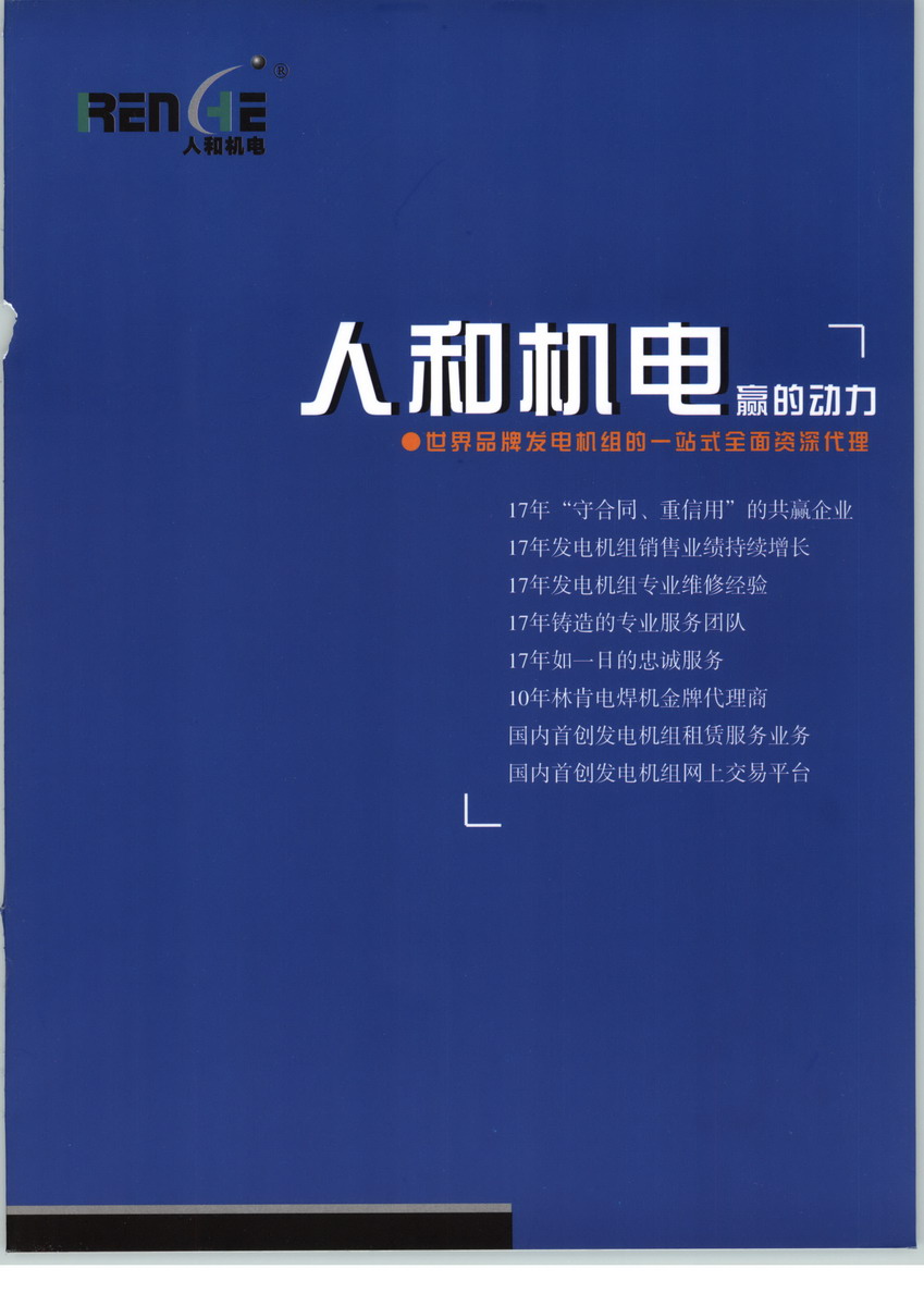 人和機電成立于1988年,是致力于提供世界著名品牌發電機組、電焊機及技術服務為主的專業公司。經過18年的發展,擁有4個子公司、4個辦事處、1個電子商務中心,成為集發電機組的制造、銷售、租賃及設備的機房設計、相應配套工程、維修服務與零配件供應于一身的同行業最大的供應商之一。北京人和世紀機電設備有限公司,主要經營人和/康明斯系列柴油發電機組;人和/大宇系列柴油發電機組;人和/富豪系列柴油發電機組,公司注冊資本未知,我公司的辦公地址位于中國的首都,政治、文化中心北京,中國 北京 北京市 朝陽區東三環北路3號幸福大廈A座1205室,我們有最好的產品和專業的銷售和技術團隊,我們為客戶提供最好的產品、良好的技術支持、健全的售后服務,北京人和世紀機電設備有限公司是北京柴油發電機組行業知名企業,如果您對我公司的產品服務有興趣,請在線留言或者來電咨詢。